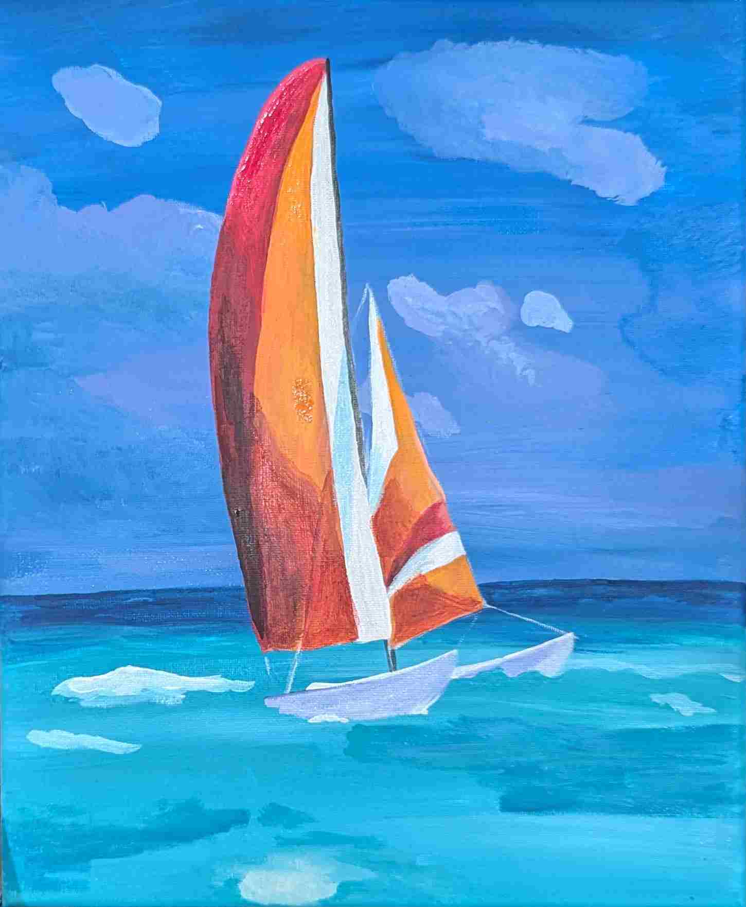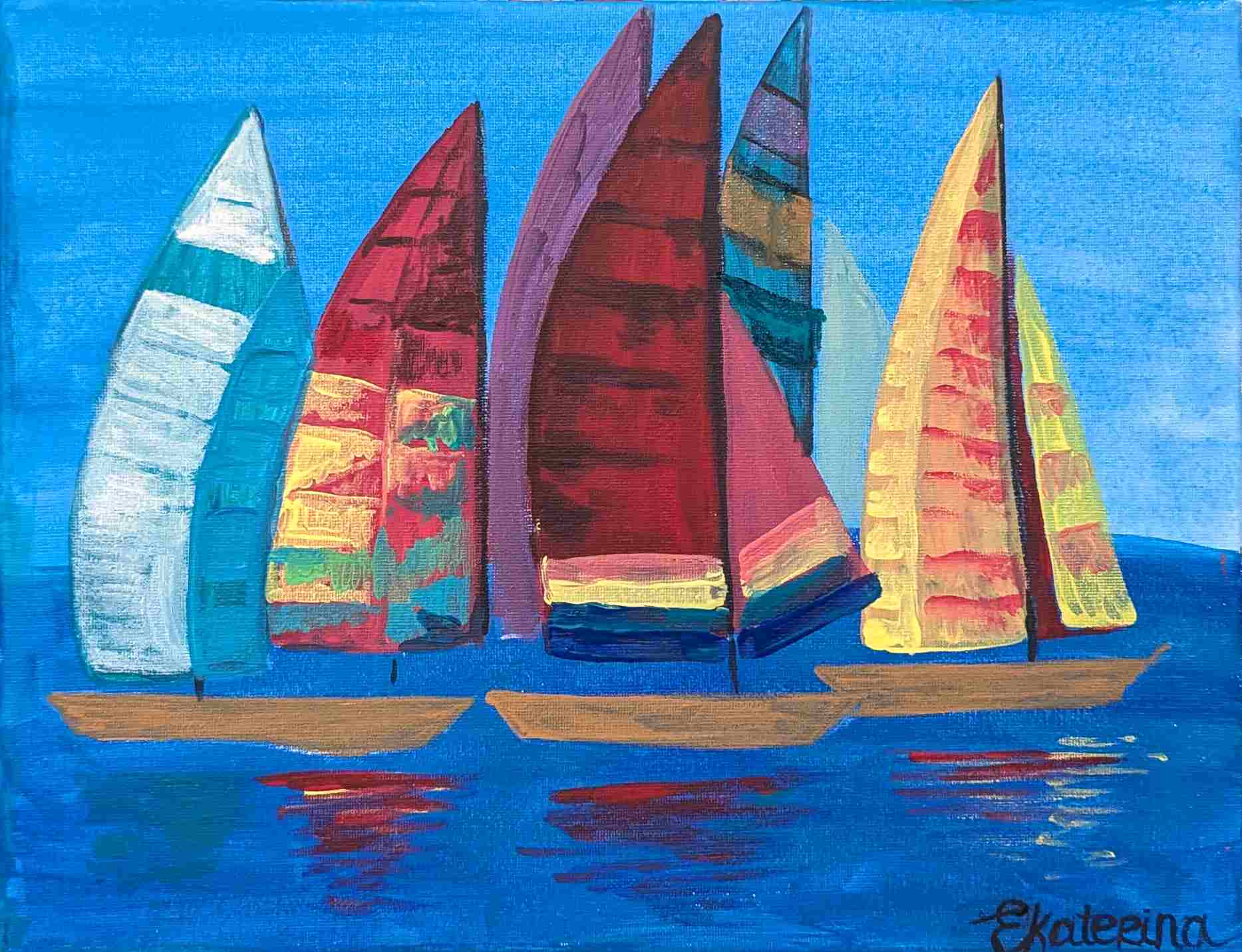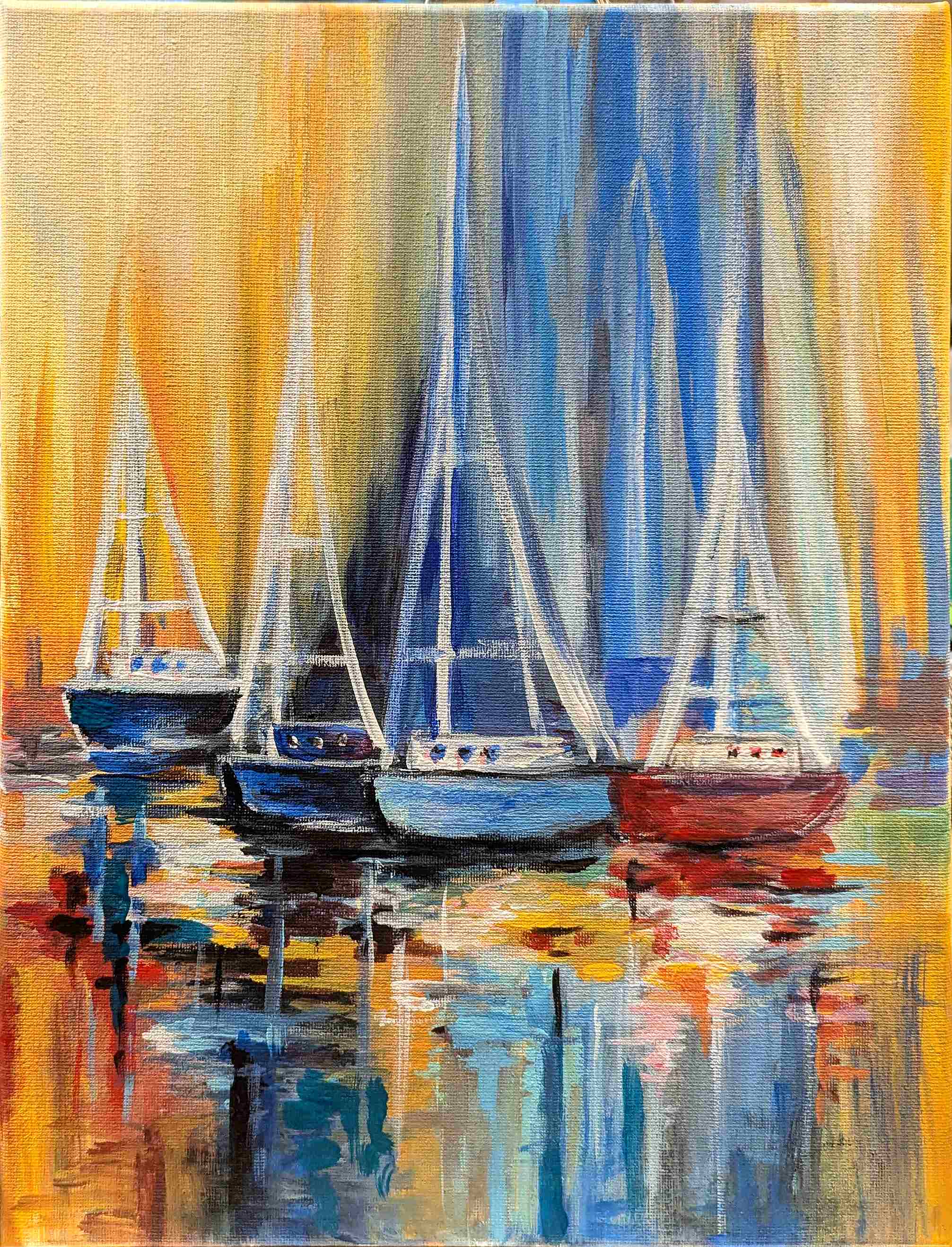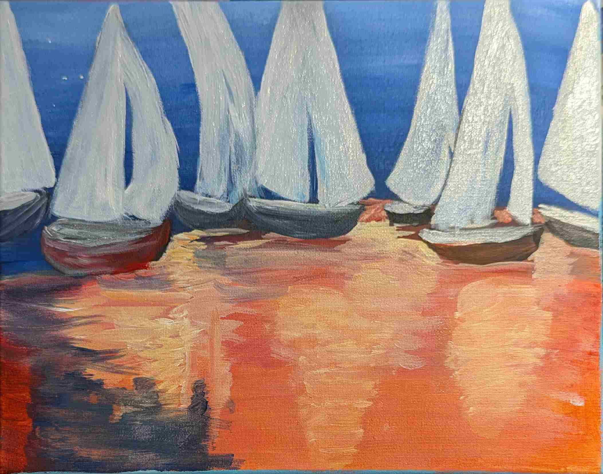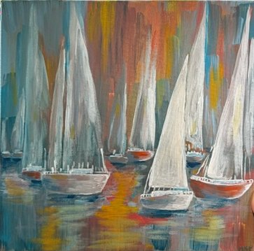 Last Wednesday, we met with my adult art class at Rush In Art Studio and painted a beautiful summer spirit acrylic painting of sailboats. The result is astonishing—everyone had their own vision of the subject, and everyone is happy. Look at these beautiful marine landscapes! Do you feel the breeze?